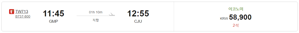위에서 검색한 동일한 일정(11.7~11.9)으로 티웨이 항공사 공식사이트에서 검색해보니 진짜로 가격이 더 싼것을 확인하실 수 있습니다. 그것도 꽤 많이 쌉니다. 네이버 항공권에서 검색한 제주도 항공권 가격은 70,000원 정도였는데, 티웨이 항공사에서는 동일 시간 동일 비행기인데도, 58,900원 밖에 안합니다.