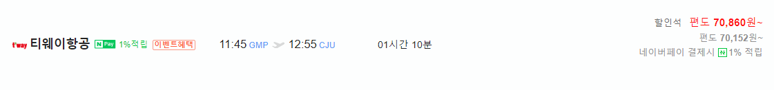 저는 네이버 항공권에서 일정을 입력하고 검색을 해보았습니다. 참고로, 제주도 출국 편을 기준으로 설명드릴건데, 귀국편도 동일한 방법으로 하시면됩니다. 일정(11.7~11.9)을 입력하고, 적당한 시간대 기준 티웨이 항공사가 제일 싸군요. 약 70,000원 정도에 예매가 가능합니다.